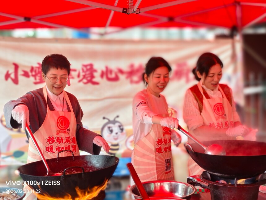 移动厨房飘出“幸福味”“小蜜蜂爱心移动厨房”的餐车前饭菜飘香,工会和基金会将“厨房”搬到了一线,不仅准备了营养均衡的丰盛午餐,还特意煮上了象征团圆甜蜜的汤圆。 刚派件回来的快递小哥们脱下工装,围坐在一起。大家暂时放下了手头的忙碌,一边吃着热气腾腾的饭菜,一边聊着家常。 饭盒里装载的不仅是食物,更是对这群勤劳“小蜜蜂”辛勤付出的肯定与敬意。