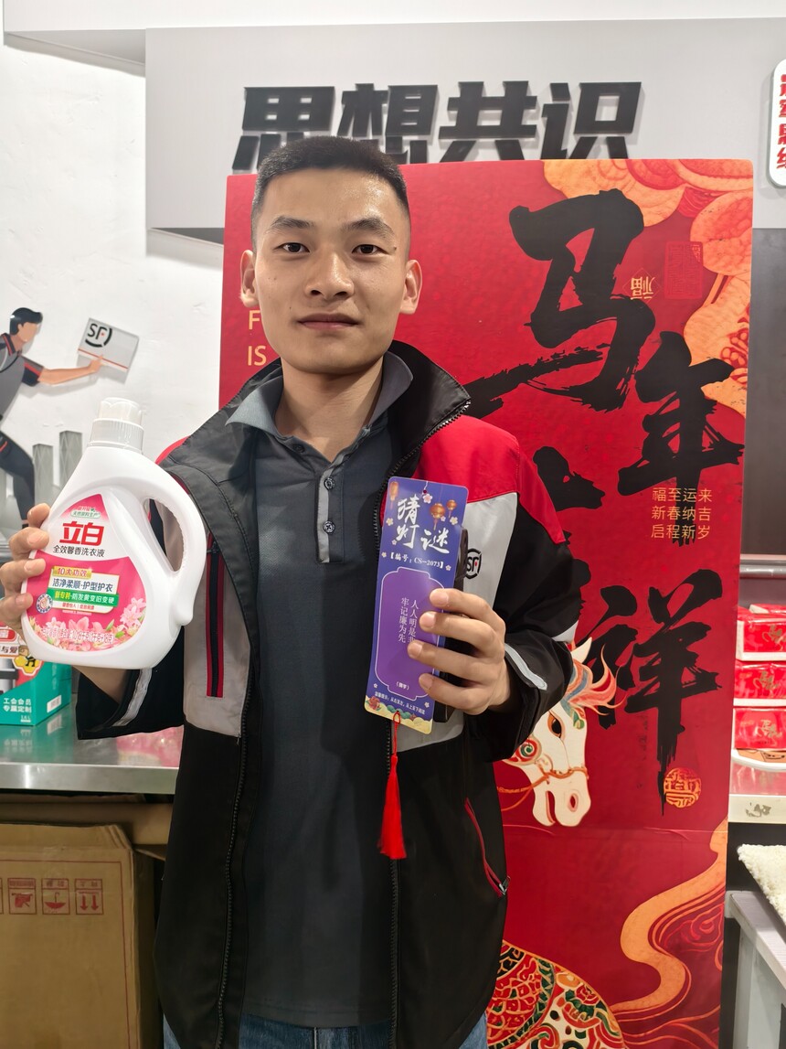 趣味游戏送到心坎上为了让关爱落到实处,活动不仅准备了美食,还精心策划了“元宵灯谜互动”和“幸运套圈圈”等趣味游戏。 猜灯谜区,大家你一言我一语,争相竞猜,现场笑声不断;套圈圈游戏区,小哥们化身“神投手”,瞄准心仪的小礼品,每一次命中都引来阵阵喝彩。 这些简单却充满趣味的游戏,让快递小哥们在繁忙的工作间隙得到了彻底的放松,现场洋溢着一张张灿烂的笑脸。